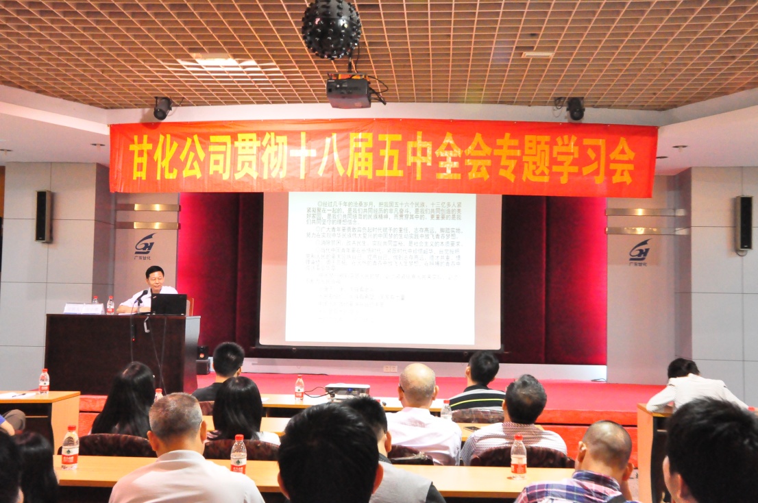 2016年5月17日下午,在甘化大廈17樓會議廳,公司黨委舉辦貫徹黨的十八屆五中全會精神專題學習會,會議由黨委書記、工會主席方小潮領學主講,重點學習貫徹黨的十八屆五中全會精神、十三五規(guī)劃綱要和全國兩會精神。公司本部、德力光電、生物中心黨、工、青、婦等員工70多人參加了會議。